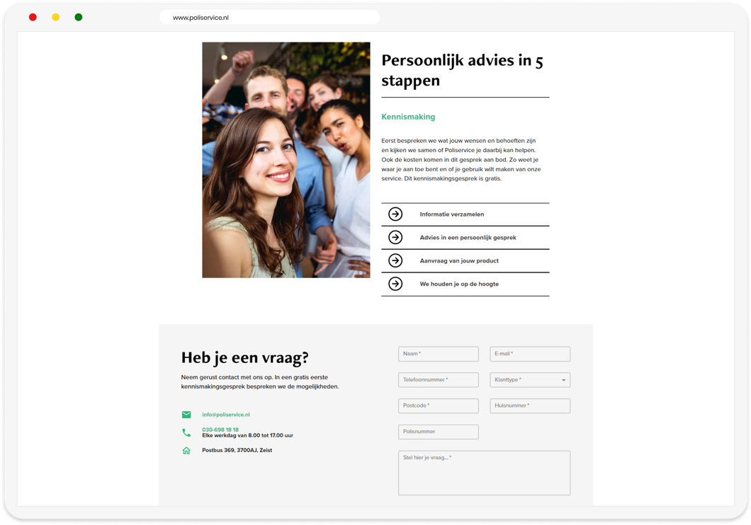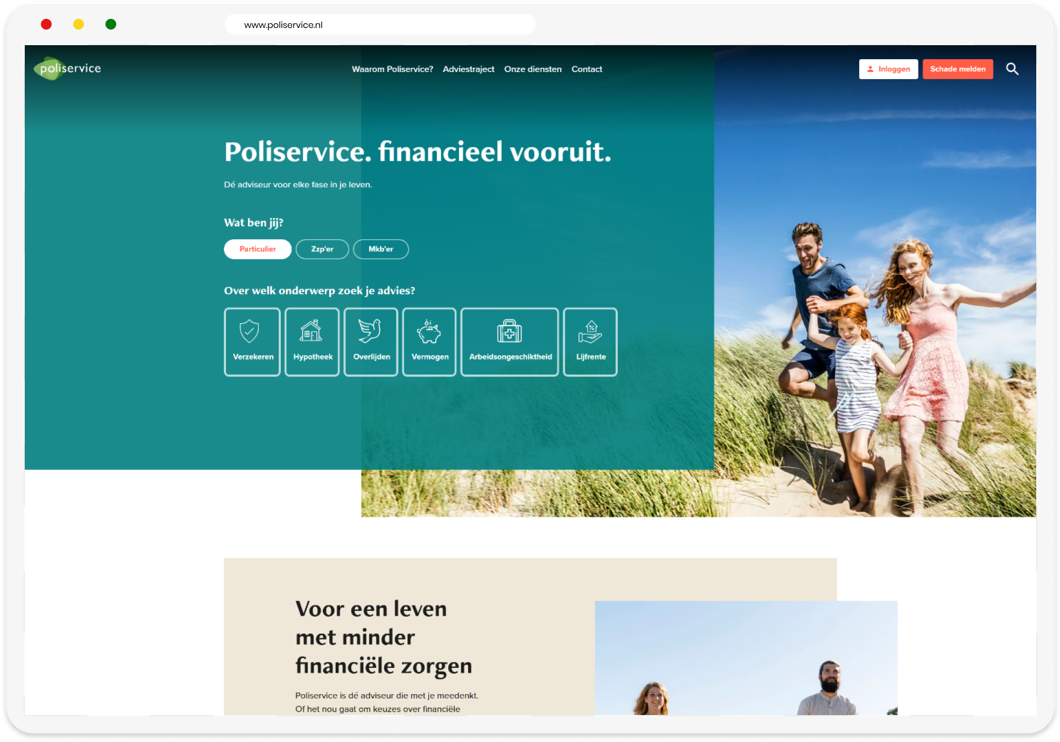 De nauwe samenwerking binnen het multidisciplinaire team stelde ons in staat om met succes een eigentijdse en goed functionerende website te creëren. Hierbij hebben we niet alleen de look & feel vernieuwd, maar ook doelgroepgerichte navigatie geïmplementeerd. Bovendien zijn er landingspagina's toegevoegd voor verzekeraars, waarbij het core content model is gebruikt voor doorontwikkeling. Dit resultaat ondersteunt Poliservice in hun missie om klanten gemoedsrust te bieden en te helpen bij weloverwogen verzekeringskeuzes.